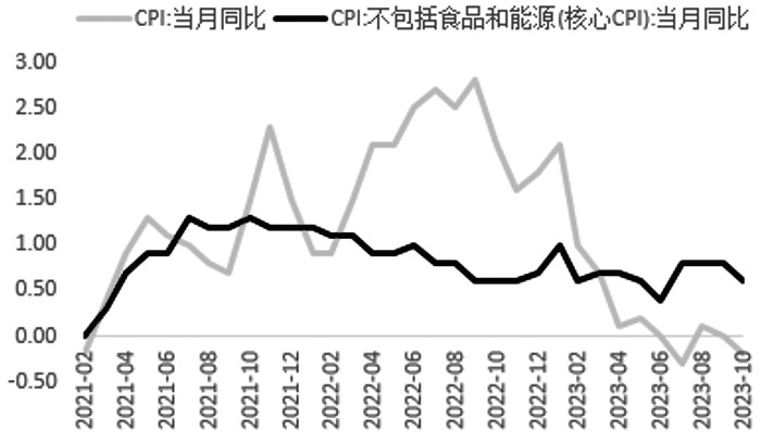 图为中美10年期国债收益率(单位:%) 跨月后,尽管资金面转松,但降准预期再度升温。一方面,特殊再融资债券发行尚未结束,年内还有5000亿元特别国债发行,11月中旬有8500亿元MLF到期,月内存在资金缺口,目前表征大型商业银行综合负债成本的1年期同业存单发行利率已经突破2.6%,短期央行增加长端资金投放解决资金期限错配的必要性增强。另一方面,受四季度再融资规模的下修和11月美联储暂停加息影响,美国10年期国债收益率快速下行带动中美利差倒挂有所收敛,减轻了外部金融环境的掣肘,打开了国内货币政策的空间,11月上旬股债情绪均有提振。 注意到10月下旬以来国债收益率曲线整体呈现牛平变化,表明这一轮国债的上涨不仅有流动性宽松预期的推动,也有基本面助力。 从近期公布的经济数据来看,目前内需修复依然缓慢,外需放缓迹象明显。11月7日,海关总署公布的外贸数据显示,以美元计,中国10月出口同比-6.4%,9月为-6.2%;进口同比3.0%,9月为-6.2%;贸易顺差565.3亿美元,9月为778.3亿美元。结合近期韩国、越南在劳动密集型产品出口较9月转弱,可以印证外需的结构性转弱可能是10月消费品和生产品出口回落的主因。10月进口同比超预期转增,其中上游大宗商品的增量较为突出,但中间品进口尚未有显著改善。此前公布的经济先行指标10月中国官方制造业PMI超季节性回落,可以佐证当前经济恢复基础仍不牢固,上游制造业或已开启主动补库,但下游需求恢复改善力度有限。 物价指数方面,10月CPI同比下降0.2%,前值为0,扣除食品和能源价格的核心CPI同比上涨0.6%,涨幅略有回落。与此同时,受国际原油价格波动和基数影响,10月PPI同比下降2.6%,9月为下降2.5%,降幅进一步扩大。10月CPI同比负增,主要受到节后消费需求回落因素的影响,但剔除食品和能源的核心CPI同比增速放缓,表明当前消费需求依然偏弱。在经济改善尚不牢固的背景下,基本面对于债市支撑仍在。但考虑前期盘面修复过程中,债市已经对基本面预期差进行定价,目前市场关注点仍然在于供给压力、资金面、政策预期和风险偏好。