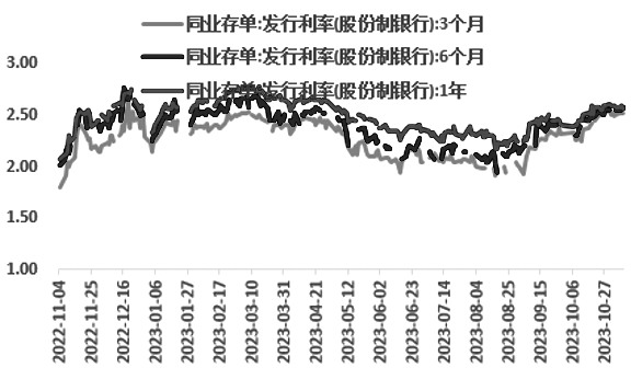 图为同业存单发行利率和国债收益率(单位:%) 10月下旬,万科多只美元债大跌引发市场关注。尽管万科第一大股东深圳国资委在11月6日万科业绩说明会上表态全力支持万科,但市场情绪仍受到冲击,随后龙湖、金地、保利等房企境内债也出现下跌。11月7日,人民银行、住建部、国家金融监管总局、证监会联合召集万科、保利、华润、中海、龙湖和金地等数家房企座谈,了解行业资金状况和企业融资需求。11月8日,央行行长、国家外汇局局长潘功胜在2023年金融街论坛年会上特别指出“弱化房地产市场风险水平,防范房地产市场风险外溢”,“引导金融机构保持房地产信贷、债券等重点融资渠道稳定”,为保障性住房等“三大工程”建设提供中长期低成本资金支持,完善住房租赁金融政策体系,推动构建房地产发展新模式。结合当日权益市场表现来看,层表态后市场情绪有所企稳。据报道,近期“第二支箭”将支持新城控股、美的置业、卓越商管等民营房企发行债券融资。同时,龙湖、金辉、华宇、新希望地产等多家民营房企债券发行项目正在稳步推进中。此次“第二支箭”发力民营房企,后续房企资金状况将优化改善,预计市场情绪会逐步企稳。