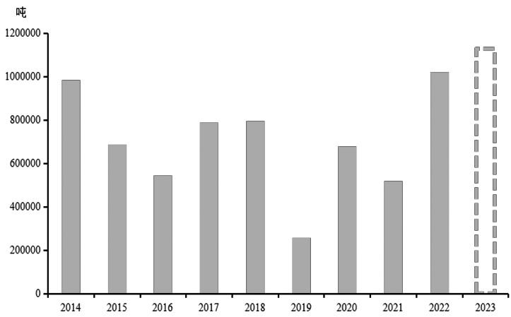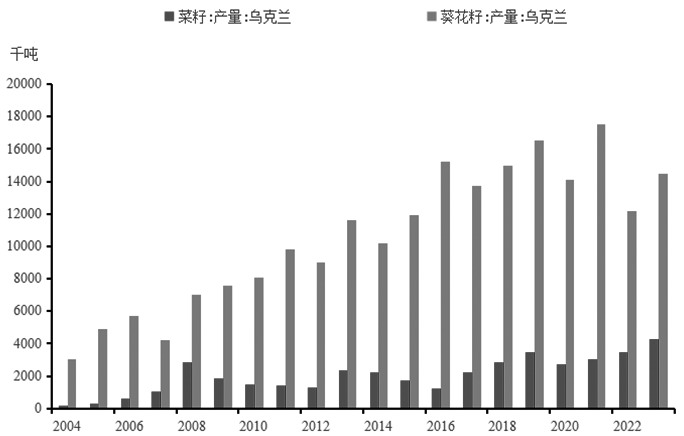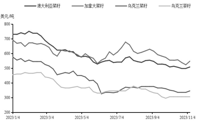图为乌克兰菜籽、葵籽产量 乌克兰的菜籽已经完成收获,2023/2024年度乌克兰的菜籽和葵籽产量均实现增长,菜籽产量预计为430万吨,较上年度增长80万吨,葵籽产量预计为1450万吨,较上年度增长230万吨。目前,乌克兰的葵籽价格已经止跌企稳,而菜籽价格跌势或仍未结束。截至11月5日,2023/2024年度欧盟累计进口98.852万吨乌克兰菜籽,进口速度偏慢。2023/2024年度乌克兰菜籽出口量预计在365万吨,2022/2023年度欧盟总计采购261.33万吨乌克兰菜籽。因此,乌克兰菜籽价格压力的充分释放仍需等待一定时日。此外,乌克兰的葵籽和菜籽FOB价格是全球油籽价格的洼地,这也促使欧盟增加对乌克兰油籽的进口,从而在国际市场中对加拿大菜籽和澳大利亚菜籽形成一定的价格压力。