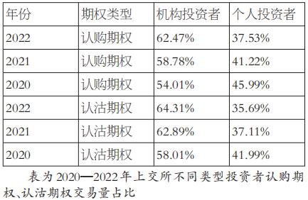图为2022年上交所机构与个人投资者交易量占比 从上交所期权市场交易量截面数据来看,机构投资者占多数,2022年机构投资者认购、认沽期权交易量分别占所有认购、认沽期权交易量的62.47%、64.31%。从时序上看,机构投资者交易量占比逐年上升,在认购期权、认沽期权中分别从2020年的54.01%、58.01%上升到2022年的62.47%、64.31%,反映出期权市场投资者机构化、专业化的趋势。