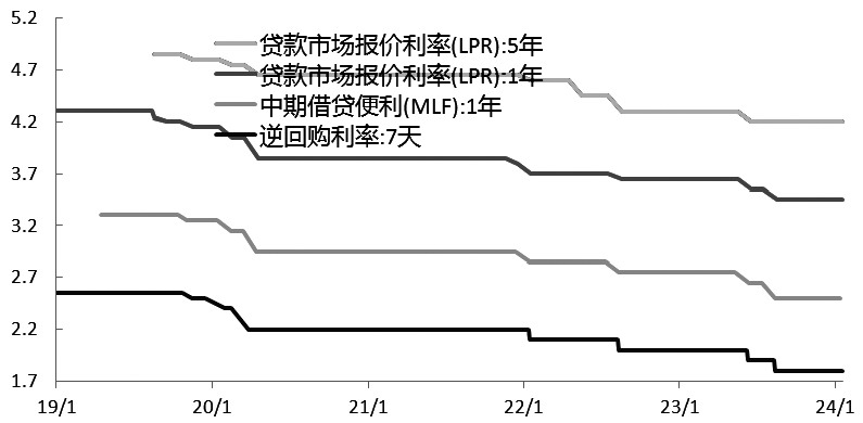2024年以来,30年期国债期货合约价格继续上涨,明显强于短期国债期货合约。1月15日,央行降息预期落空,但TL2403合约短暂调整后继续上涨,在货币政策趋于稳健的情况下,市场预期经济修复仍需要时间。近期市场避险情绪升温,TL2403合约突破103.7元,创上市以来新高,超长期国债收益率跌破2.72%,国债期限利差进一步平坦化。 主要经济目标实现 据国家统计局初步核算,2023年国内GDP为1260582亿元,按不变价格计算,较上年增长5.2%,其中第四季度GDP同比增长5.2%,高于前值但低于市场预期。分项看,2023年12月规模以上工业增加值同比实际增长6.8%,前值6.6%,增速为2022年2月以来最高,工业生产继续保持稳健复苏态势。社会消费品零售总额同比增长7.4%,增速较前值回落,略低于市场预期。固定资产投资(不含农户)同比增长3.0%,符合市场预期,其中基础设施和制造业投资继续保持较高增速,但房地产开发投资和商品房销售面积同比下降,且降幅均继续扩大,稳地产政策效果仍待显现。新增人民币贷款11700亿元,同比少增2300亿元。具体看,居民当月贷款增加2221亿元,其中居民短期贷款增加759亿元(较前值有所增加),中长期贷款增加1462亿元(环比和同比较前值均有所减少)。 总体看,2023年主要经济预期目标圆满实现,但当前外部环境复杂、严峻,不确定性上升,国内经济发展仍面临一定的困难和挑战。 LPR保持不变 1月22日,央行授权全国银行间同业拆借中心公布贷款市场报价利率(LPR),1年期LPR为3.45%,5年期LPR为4.2%,均持平前值,符合市场预期。1月15日,央行开展890亿元公开市场逆回购操作和9950亿元中期借贷便利(MLF)操作,利率保持不变。对冲当月7790亿元到期MLF后,净投放2160亿元。