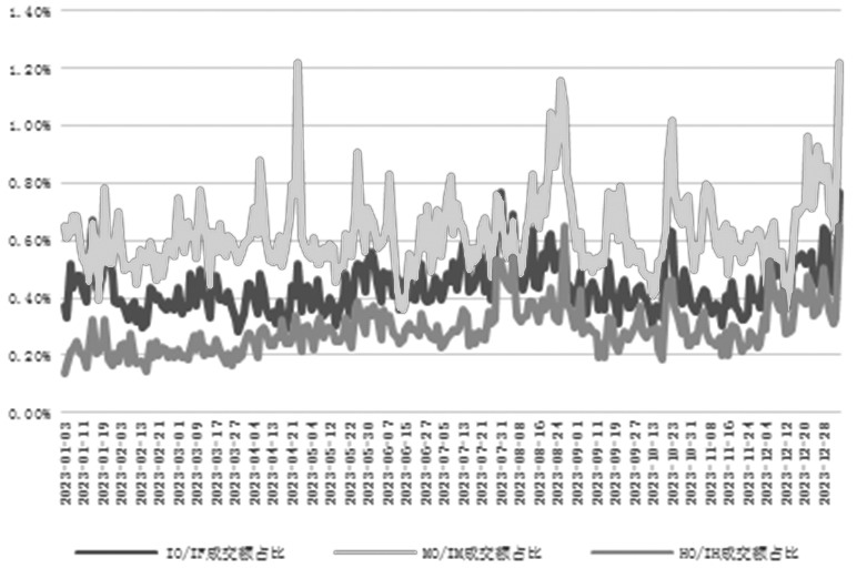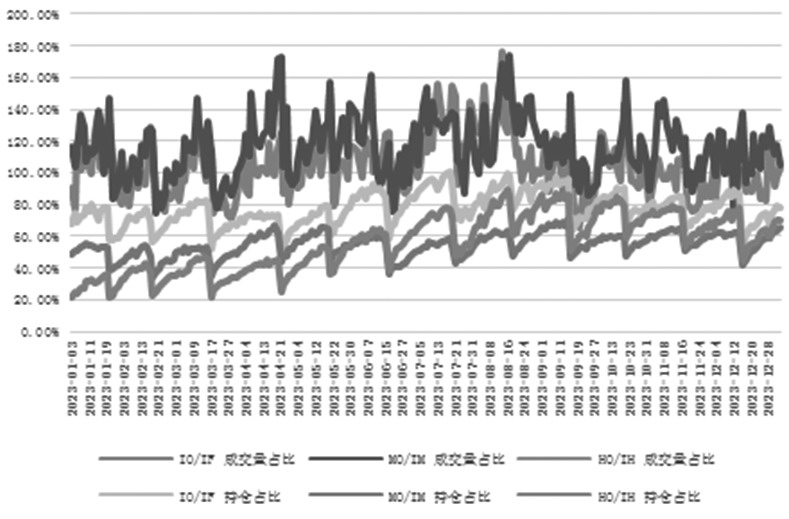 表为2022年和2023年股指期权日均交易数据 股指期权的市场数据与对应股指期货相比,沪深300股指期权的日成交量最大是沪深300股指期货日成交量的1.76倍,期权日均持仓量最大与期货持平;中证1000股指期权的日成交量最大是中证1000股指期货的日成交量的1.74倍,期权日均持仓量最大为期货的71%;上证50股指期权的日成交量最大是上证50股指期货的日成交量的1.21倍,期权日均持仓量最大为期货的90%。考虑到股指期权和对应股指期货合约乘数不对等,将合约乘数配比相等后,二者成交比、持仓比相应下降。 越临近股指期权和股指期货最后交易日,期权成交量和持仓量相对于股指期货增速变大。股指期权成交额低于对应股指期货,成交额占比最高至1.2%,主要是期权权利金较股指期货保证金优惠。