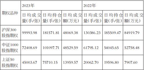 [国内已上市12个金融期权产品] 金融市场全面深化注册制改革,国内各大交易所加快推进期权品种上市。2023年8月18日,中金所发布《关于深证100股指期货和股指期权合约及相关规则向社会征求意见的通知》,深证100股指期权上市可期。截至2023年年底,中金所上市了3个股指期权,上海证券交易所上市了5个ETF期权,深圳证券交易所上市了4个ETF期权,共计12个金融期权产品。 [股指期权交易数据高于对应股指期货] 2023年,上证50ETF期权是我国金融市场上流动性最为充足的期权品种,上交所的沪深300ETF期权、深交所的创业板期权紧随其后,上交所的中证500ETF期权流动性排名第四,科创板的50ETF期权流动性排名第五。中金所的股指期权由于对应的合约份额较大和限仓等制度,成交表现相对较弱。不过,由于股指期权存在现金结算等优良制度,机构投资者操作意愿日趋增强。
