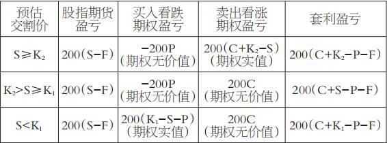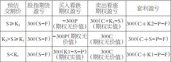 图为上证50股指期权领口策略到期盈亏 从到期盈亏图中看出,买入3手HO2311P2400和卖出3手HO2311C2500形成折式合成期货空头头寸,折式合成期货空头一定程度上复制了期货空头,在指数大跌时,能够达到收益无限。同时折式合成期货头寸的建仓成本比合成期货头寸需要的初始资金少,主要是卖出虚值行权价期权合约需要的保证金要低于卖出实值行权价的保证金。最后,折式合成期货头寸的保证金要小于股指期货。 [空头领口策略盈亏分析] 构建空头领口策略,持有沪深300或者上证50股指期货空头头寸,持仓成本为F;买入相同月份行权价为K2看涨期权花费支出权利金单价P,卖出行权价为K1的看跌期权收到权利金单价C,K1<K2。即买入高行权价的看涨期权,卖出低行权价的看跌期权。 假设交割价S≥K2,股指期货盈亏为(F-S)×300;看涨期权实值到期,前期支付权利金C×300,以价格K2买入上证50指数对应的一揽子股票,然后按照S点位现金交割,则交割盈利300(S-K2),看涨期权盈利(S-K2-C)×300;看跌期权无价值到期,收到权利金P×300;整体收益为(F+P-C-K2)×300。 假设交割价K2>S≥K1,股指期货盈亏为(F-S)×300;看涨期权无价值到期,前期支付的权利金C×300亏损;看跌期权无价值到期,收到权利金P×300;整体收益为(F+P-C-S)×300。 假设交割价S<K1,股指期货盈亏为(F-S)×300;看涨期权无价值到期,支付权利金C×300全部亏损;看跌期权实值到期,前期收到支付权利金P×300,按照K1买入上证50指数对应的一揽子股票,然后按照S点位现金交割,盈利(S-K1)×300,看跌期权盈亏为(P+S-K1)×300;整体收益为(F+P-C-K1)×300。 对比空头领口策略和多头领口策略,发现最后交易日两者的盈亏互为相反数。