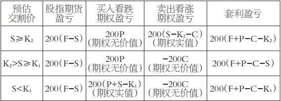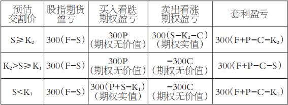 表为沪深300股指期权或者上证50股指期权领口策略到期盈亏 当F+P-C-K2≥0时,空头领口策略可以实现最大盈利为300(F+P-C-K1),最小盈利为300(F+P-C-K2)。 当交割价S<K1,空头领口策略最大盈利为300(C+K2-P-F);当交割价S≥K2,最大亏损是300(C+K1-P-F)。 同样可以推算出,利用中证1000或者深证100股指期货和股指期权构建空头领口策略,到期盈亏如下表所示: