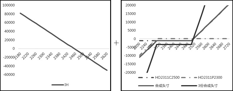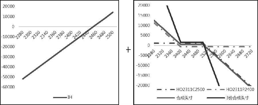 表为中证1000股指期权领口策略到期盈亏 代入具体数据:持有1手股指期货空头IH2311,持仓成本为开盘价2452.8元/点;按照0.6元/点卖出3手行权价为2300元/点的11月份上证50看跌股指期权(HO2311P2300);按照11.6元/点买入3手行权价为2500元/点的11月份上证50看涨股指期权(HO2311C2500)。 当交割价在2300元/点下方,存在无风险套利42540元;当交割价在2300元/点到2500元/点,套利盈亏线性;当交割价在2500元/点上方,亏损17460元。 从到期盈亏图中看出,买入3手HO2311C2500和卖出3手HO2311P2300形成折式合成期货多头头寸,折式合成期货多头一定程度上复制了期货多头。但同时建仓成本相对要较少的初始资金,并且在指数大涨时,能够达到收益无限。
