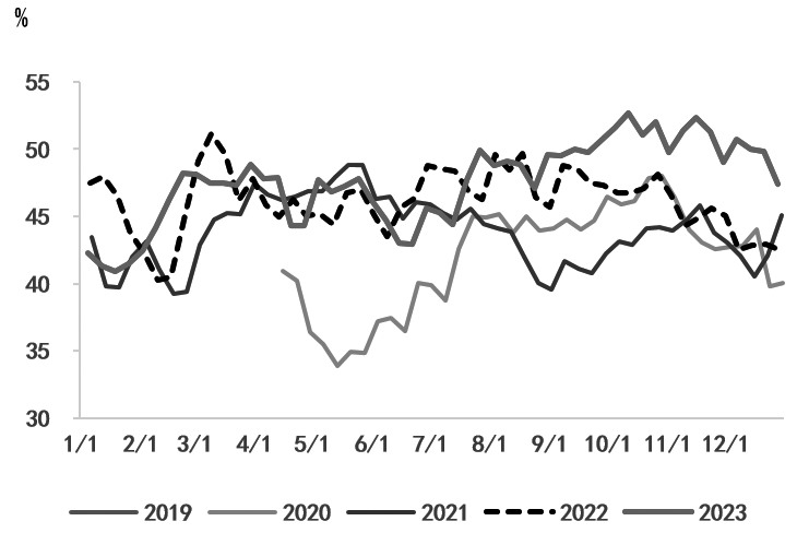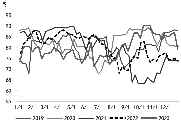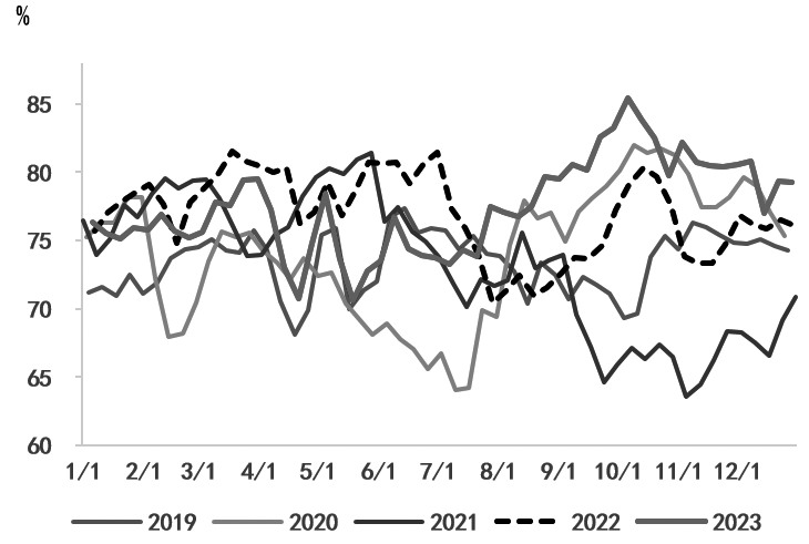[2023年行情回顾] 2023年,甲醇期货整体呈现V形走势,一季度、二季度甲醇价格以下行为主,三季度反弹上行,四季度高位回落后开启振荡行情。结合成本端煤价、宏观情绪和甲醇供需情况来看,上半年在进口量增加、供应充足、需求淡季的情况下,煤炭价格承压,从而带动甲醇成本支撑走弱。 2023年春节前,关于国内经济修复的强预期未能兑现,而甲醇产量和进口量均处在高位,市场供需表现偏弱。春节后,甲醇需求偏缓,下游MTO低位运行。3月,在美联储加息背景下,欧美银行发生危机,外围恐慌情绪蔓延,宏观预期转弱,带动能源和化工品价格下行。三季度,煤电旺季叠加安检限产,煤炭价格走强,而MTO和甲醇传统下游需求开工均有显著提升,甲醇基本面存在上行驱动。四季度,旺季需求对煤炭价格存在一定支撑,但受制于高库存以及暖冬需求不及预期,煤炭价格振荡偏弱,而甲醇进口量居于高位,给供应带来压力,并且下游MTO开工高位回落,供需仍显宽松,甲醇振荡偏弱运行。 [开工率进一步提升] 2023年,国内甲醇产能达到11115万吨,新增产能为622.5万吨,供应增速达到6%。据第三方资讯机构预计,2024年,甲醇新增投放产能将为785万吨,包括内蒙古宝丰660万吨、内蒙古君正55万吨、河南晋开化工30万吨和宁夏冠能40万吨。2024年,甲醇新增产能增速将为7%,同比持平于2023年水平。2023年,国内甲醇产量为8403万吨,比2023年增加3.76%;国内甲醇产能利用率在70%—85%区间波动;国内甲醇行业利用率均值为77.4%,较2022年的76.8%有所提升。 生产节奏方面,2023年,甲醇开工前低后高。一季度、二季度,受煤制甲醇利润偏低的影响,甲醇开工率维持低位水平,较2022年同期显著回落。三季度,受利润改善和下游需求支撑影响,甲醇开工率快速上扬至往年同期高位。四季度,天然气制甲醇开工虽有季节性回落,但受煤制甲醇开工支撑,甲醇开工率仍维持高位运行。