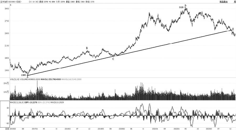 玉米从最高位D点开始调整,至今已经有近两年的时间,空间结构上也完成了标准5浪形态,若能在E点有效止跌,则再度挑战前高是大概率。然而,玉米已经有效跌破了E点位置,也就是A点、C点重要低点组成的玉米最重要的支撑线,挑战新高的可能性大幅降低。盘面上经过连续的下行价格出现超跌特征,加上MACD业已形成鲜明“背离”,短期有反弹修复的要求。但中长期看,下一个重要支撑在50%回调位,即2200元/吨位置,当前还不宜全面看多。(顾敏忠 期货投资咨询从业证书编号Z0002449) (责任编辑:admin) |