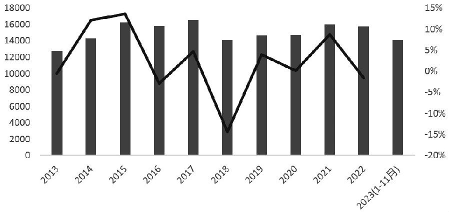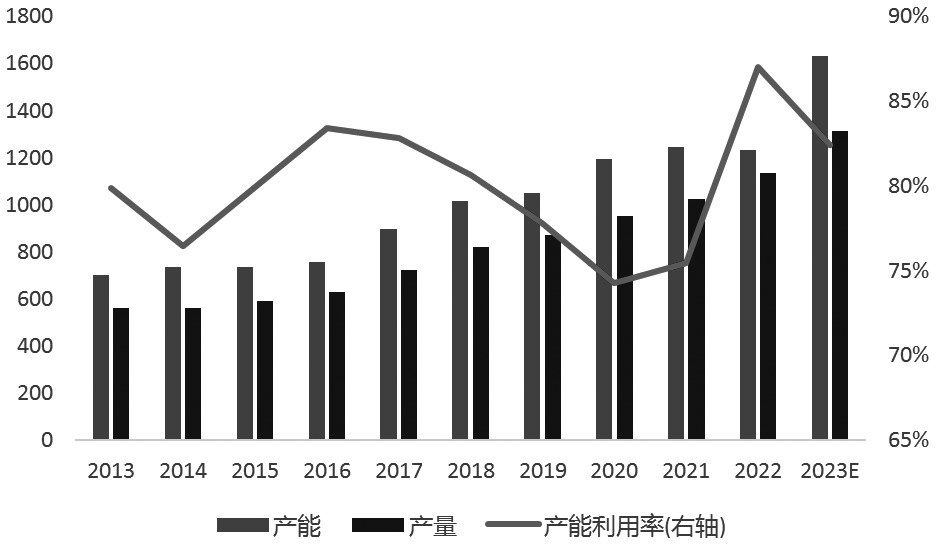 图为2011—2021年全球聚酯瓶片净出口情况(单位:万吨) [中国聚酯瓶片供需情况] 供应 从2011年起,中国已经成为全球聚酯瓶片最大的生产国、消费国与净出口国,中国在全球聚酯瓶片格局中的地位举足轻重,因此,在世界聚酯瓶片供需情况的研究过程中,分析中国聚酯瓶片的供需情况是必不可少的。 在国内聚酯瓶片市场供应方面,2014—2016年,中国瓶片行业自发性进行去产能,淘汰落后装置,并对长时间停产的装置进行处理。到了2017年,中国聚酯瓶片行业的产能开始呈现恢复增长的趋势。其中万凯、华润、三房巷、逸盛等中国龙头企业主导了扩能的过程。从2018年开始,伴随着民营炼厂的扩张和投产,以及行业头部企业的扩张推动,中国瓶片行业启动了新一轮扩产周期,使得中国瓶片产能进入千万吨时代。据统计,截至2023年年底,中国聚酯瓶片的总产能达到1631万吨,同比增长32.5%;产量为1314万吨,同比增长15.8%;预计表观消费量为838.4万吨,同比增长18.4%。 从我国聚酯瓶片产能分布区域来看,聚酯瓶片产能主要集中在华东、华南与西南地区,其中产能最大的五个省市分别是江苏、海南、重庆、广东和浙江,五省市产能合计占比80%。从聚酯瓶片生产企业分布来看,我国聚酯瓶片行业集中度较高,2023年,产能超过100万吨的生产企业有三房巷、华润、逸盛、万凯,约占国内瓶片总产能的72%。