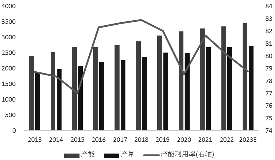 [聚酯瓶片基本情况] 聚酯瓶片是通过精对苯二甲酸(PTA)和乙二醇(MEG)聚合酯化而成的一种合成聚合物。聚酯瓶片具有均匀的晶体结构,有助于提高其物理强度和透明度,且由于其低成本、轻质、高透明度和可回收利用等优势,聚酯瓶片在包装行业中得到广泛应用,主要用于饮料瓶、食品包装、化妆品瓶、药品瓶等容器。 聚酯瓶片是聚对苯二甲酸乙二醇酯(简称聚酯,PET)的一种产品形态,具体来看,是通过加工工艺将聚酯制成薄片状,得到聚酯瓶片。聚酯包括聚酯纤维(涤纶)、聚酯瓶片和聚酯薄膜。在国内市场,聚酯纤维占比聚酯需求的75%以上,包括涤纶长丝和短纤等,主要用在纺织品行业;聚酯瓶片约占聚酯需求的20%,主要应用于瓶用包装和片材等,其中,软饮料瓶和油瓶等瓶用包装占聚酯瓶片需求的70%左右,片材与其他用途约占30%。 [全球聚酯瓶片市场供需情况] 供应 2013—2023年,全球聚酯瓶片的总产能大幅增加,从2410.3万吨增加到3456.5万吨。在这期间,产能增速在2013—2015年相对较快,平均年增速为6.03%,增量主要来自中国、中东、非洲和南美地区。然而,2016年全球经济仍在经历深度调整,全球经济增速放缓,能源化工产品基本处于底部回升期,导致2016年聚酯瓶片产能出现负增长。2013—2023年,全球瓶片产能利用率维持在77%—83%,这表明尽管产能在不断扩张,但产能利用率变化不大,整体上没有出现明显的减产或停产情况。主要因为全球瓶片的消费量也一直在增长,这一趋势支撑着产能利用率保持在80%左右的水平。 截至2023年11月底,CCF数据显示,2023年全球聚酯瓶片产量与消费量分别预估为3018万吨与3176万吨,其中消费量超出产量的部分多数为2022年前期累积的库存。与往年相比,2023年全球瓶片产能利用率为76.6%,处于较低水平,原因在于受能源、运输与人力成本上涨等影响,海外部分地区平均产能利用率较低,尤其是欧盟地区,多数装置长时间低负荷运行,且美国新增产能推迟投产。