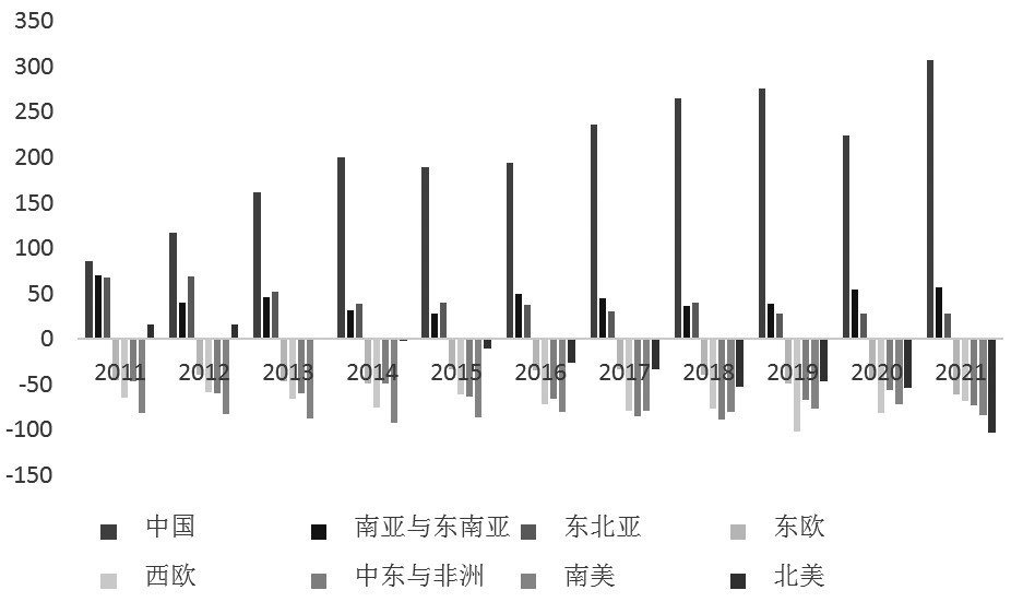 图为2013—2023年全球聚酯瓶片产量与消费量对比,以及消费增速(单位:万吨,%) 贸易流向 从全球聚酯瓶片贸易流向来看,亚洲地区是主要的净出口地区,特别是中国作为全球最大的净出口国家,其出口量呈现明显的快速增长趋势。东北亚、南亚和东南亚仍然是亚洲地区的净出口地区。 另外,北美地区在2014年以前曾是净出口地区,但自2014年以来却成为净进口地区,并且净进口量呈逐年增长的趋势。聚酯瓶片的净流入地区主要集中在美洲、欧洲、中东和非洲。近年来,美洲地区的净进口量有明显增长,而欧洲、中东和非洲地区的净进口量则呈现小范围波动。 2023年,根据Bloomberg的数据,美洲占全球瓶片产能约19%,主要来自于美国,同时美洲是全球瓶片的主要消费地区之一。由于2022年年底,聚酯成本较高,美洲部分瓶片装置出现减产,下游客户转向采购进口货,进口高峰提前到来,但美国和南美国家难以在短期内快速消化,最终进口量下降;后期伴随消费旺季,供需逐渐好转。根据CCF的数据,整体来看,2023年美洲占全球进口量下跌至26%附近。欧洲是瓶片主要消费地区之一,由于近年来无新增产能,全球产能占比下滑至11%附近,且多数装置出现减产或停车,因此对瓶片进口需求较高,整体来看,2023年欧洲占全球进口量约36%,同比小幅增长。