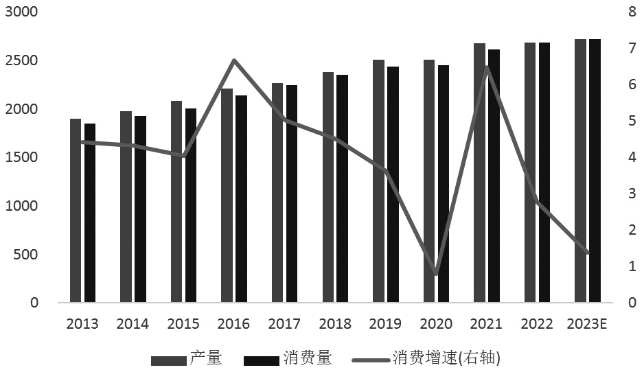 图为2013—2023年中国聚酯瓶片产能、产量及产能利用率趋势(单位:万吨,%) 消费 国内聚酯瓶片的消费领域主要为软饮料、食用油等瓶用包装,占总需求的70%。从2023年聚酯瓶片下游消费流向来看,主要有软饮料、出口、片材与其他、油瓶,分别占聚酯瓶片总产量的40%、38.5%、18.3%、3.2%。 作为聚酯瓶片最大的下游产品,瓶装饮料的市场直接影响着聚酯瓶片的市场。在2016年以前,中国软饮料市场稳步增长,但软饮料产量增速逐年下降;到2016年以后,中国软饮料市场的增长格局转为振荡波动格局,这与中国经济的整体走势相似,即从高速增长阶段转为经济下行压力较大阶段。