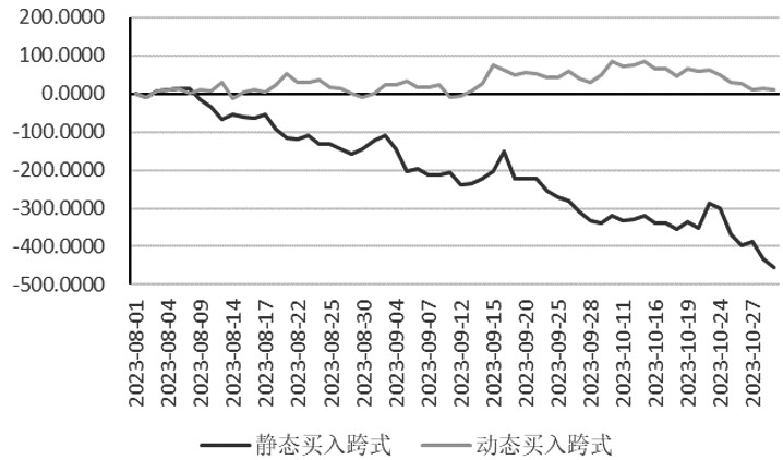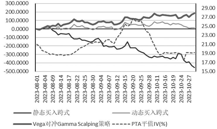 图为基于Vega对冲的Gamma Scalping策略(2023年10月至2024年1月8日) PTA期权Gamma Scalping策略 PTA期权为美式期权,定价方面与欧式期权不同,但波动率交易策略原理相同。本文选取了2023年8月至10月的样本数据进行研究,该时间窗口内PTA价格以区间振荡为主,变动区间在5700—6500元/吨。与上文IO期权操作模式一样,每个买入跨式组合权利金成本普遍在200元/吨至300元/吨(每手PTA期权乘数5吨,每个组合策略实际支出在1000—1500元),静态模式分别在8月、9月、10月初根据当时PTA价格构建平值买入跨式,并持有到期。从下图中可以看出,由于8月至10月期间PTA价格先涨后跌,终值接近初值,买入平值跨式持有不动等待到期的做法不利,这种静态模式累计浮亏了455元/吨。此外,按照上文介绍的动态模式,PTA价格每变化200元/吨,根据平值行权价进行一次买入跨式调仓,损益整体表现得到较大提升,累计浮盈12元/吨,损益起伏变化较小,其间最大盈利76元/吨,最大浮亏10.5元/吨。