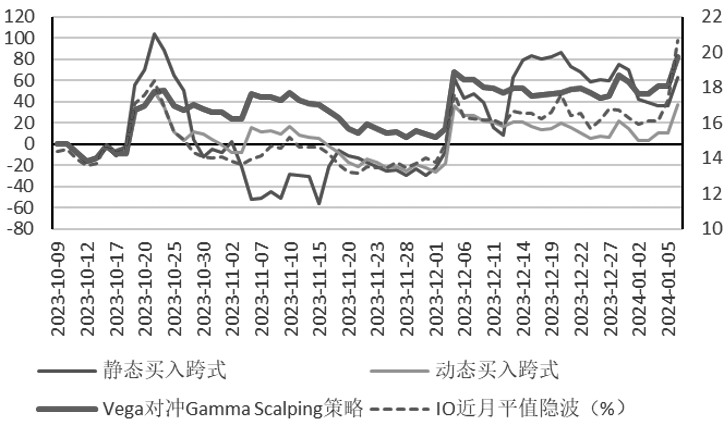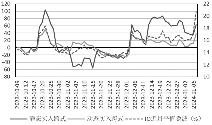 表为IO平值期权指标测算 [期权Gamma Scalping策略实证研究] IO期权Gamma Scalping策略 基于样本数据文章分别以IO期权与PTA商品期权为例,实证研究Gamma Scalping策略,首先以IO期权为例,在2023年10月至2024年1月8日,相比前几年的偏高波动率行情,该时间窗口中,沪深300指数整体波动率不高,其间出现过短线升波行情。在实际行情中,静态的买入跨式并持有到期,容易在宽幅振荡行情中磨损时间价值,比如指数从3650下跌至3500,再回升至3650,单一的静态持有买入跨式可能只赚了过程,但结果亏损。但是按照动态模式,每当指数变动50点,将已有仓位转换为新的行权价建仓买入跨式,即当指数在3650时,同时买入行权价为3650的看涨、看跌期权,随着指数变为3600,则可将仓位止盈离场,转换为行权价为3600的买入跨式组合,以此类推动态调整。 对比几个策略表现,由于随着指数变化,Delta敞口变化,买入跨式策略静态持有模式损益起伏大,在下图中,每个近月买入跨式组合构建成本大约150点(每一点100元),静态模式,其间最大浮盈103.6点,最大浮亏55.8点。相比之下,动态模式可以很大程度降低Delta敞口,其间最大浮盈49.8点,最大浮亏25.4点,损益起伏程度小于静态模式。隐波回落对这两种模式的损益产生较大负面影响,10月与12月均出现了指数反弹隐波快速回落的行情。通常隐含波动率数值曲线走势呈现脉冲式特征。当隐波急涨之后,合约波动率溢价较高,如果继续持有买入跨式组合,面临着隐波大幅回落带来的Vega风险敞口。因此,当隐波经历一波急涨后,需要对冲Vega风险敞口。