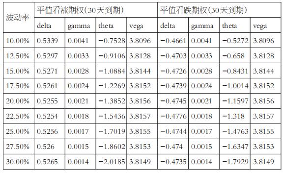 表为希腊字母计量公式 下表为30天到期、不同波动率定价情况下的平值期权指标测算。隐波与合约Gamma值成反比,当合约隐波偏低时,买入跨式组合获得的Gamma潜在收益越大,且在高隐波状态下,时间价值衰退带来的Theta影响更大,对于动态模式的Gamma Scalping策略,面临高隐波时,需要对冲隐波大跌的Vega风险。结合公式与下表数据,假设构建隐波15%,30天到期的平值买入跨式,那么该组合建仓时对应的短线损益估算公式为: 0.0545×(ΔS)+0.0028×(ΔS)2-1.8515×ΔT+3.8144×Δ(IVC)+3.8144×Δ(IVP) 该买入跨式组合(1:1比例)存在微小的正Delta敞口,若投资者希望完全中性,可以适当增加看跌期权仓位,本文采用1:1的比例作案例展示,当标的指数下跌50点时,4.275-1.8515×ΔT+3.8144×Δ(IVC)+3.8144×Δ(IVP),当隐波不变时,指数下跌50点可以覆盖两天多的时间价值磨损;反之,当指数上涨50点时,9.725-1.8515×ΔT+3.8144×Δ(IVC)+3.8144×Δ(IVP)。隐含波动率的变化是策略盈亏表现的重要因子,当隐波比较低的时候,回升均值的概率上升,策略盈利概率增加。此外,投资者如果需要更大的Gamma效果,可以选择到期时间较少的近月合约,在历史行情中,也会出现临近到期日指数巨幅波动的情况,带来了丰厚的Gamma收益,但另一方面需要面临较大的时间价值衰退,投资者需要综合考虑二者的影响。