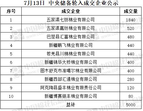 7月13日棉花轮入成交5000吨 成交率100% 均价16254元/吨 中国棉花信息网 07月13日 7月13日,中央储备棉轮入成交5000吨,有10家企业竞卖成交,企业公示如下:(文章来源:中国棉花信息网) (责任编辑:admin)