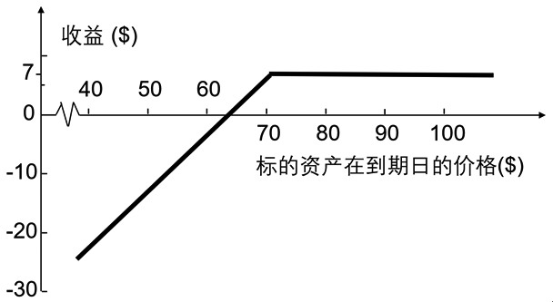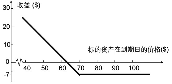 图为买入看涨期权收益与标的资产价格关系 卖出看跌期权使用动机,取决于投资者风险和收益策略的权衡。卖出看跌期权收取了权利金,当标的期货价格下跌,卖出看跌期权与买入标的期货合约一样会产生损失,但权利金收入可以弥补下跌产生的部分损失。当标的期货价格上涨,卖出看跌期权最大收益为权利金。当投资者预期标的价格不跌(上涨或窄幅振荡),卖出看跌期权较适宜。卖出看跌期权,卖方收取一定数量的权利金,买方行权时,卖方有履约的义务。如果看跌期权到期被放弃行权,卖方获得全部权利金。 对于看跌期权卖方来说,当市场价格下跌时,看跌期权面临风险,而当市场价格上涨时有可能获得全部权利金,期权到期时盈亏平衡点等于行权价格减去卖出期权时收取的权利金。