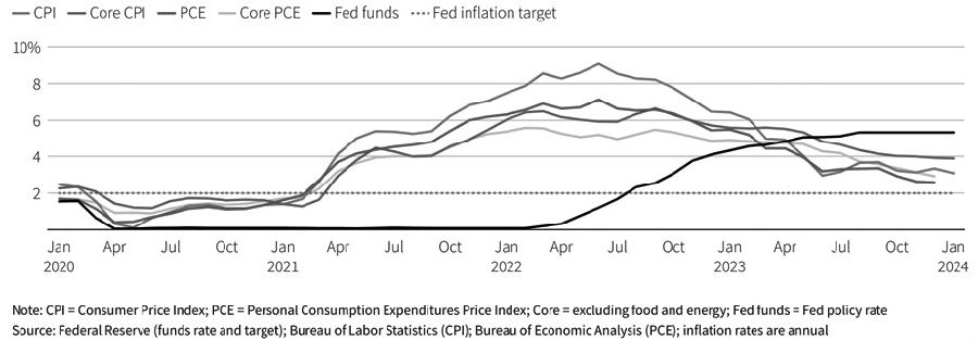 图为美国各项CPI及核心CPI指数、PCE、联邦利率走势对比