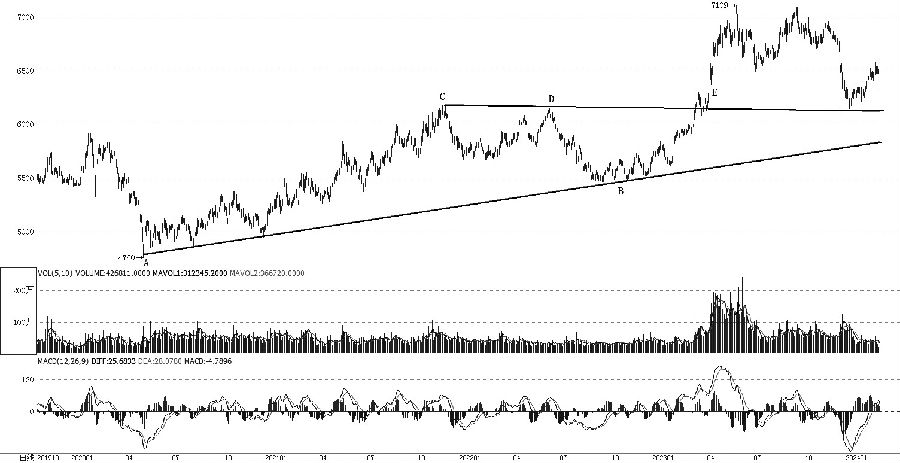春节后首个交易日,白糖低开振荡,昨日又巨阴下跌,一改之前多头上行态势,建议继续偏空对待,直至遇到下方支撑。下方的重要支撑有两组:第一组是高点A和高点B构成的连线与缺口E组成,在6300元/吨位置产生强支撑区;第二组是趋势低点C和D构成的趋势支撑与缺口F组成,将在6000元/吨位置产生更强支撑区。(顾敏忠 期货投资咨询从业证书编号Z0002449) (责任编辑:admin) |