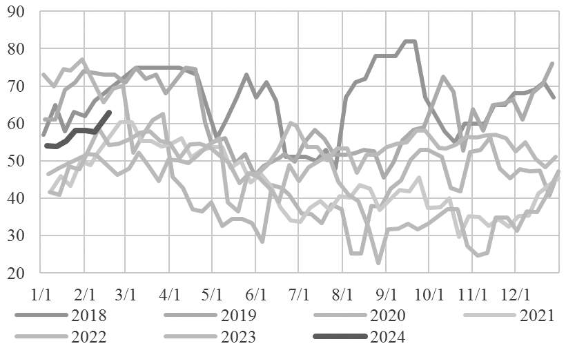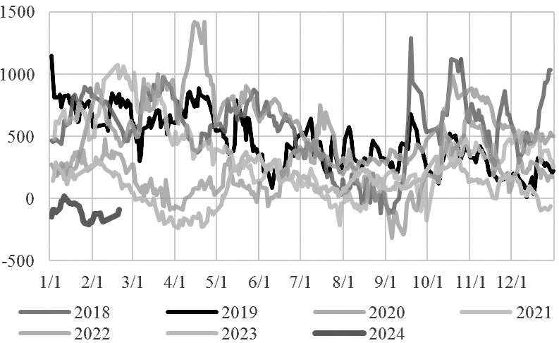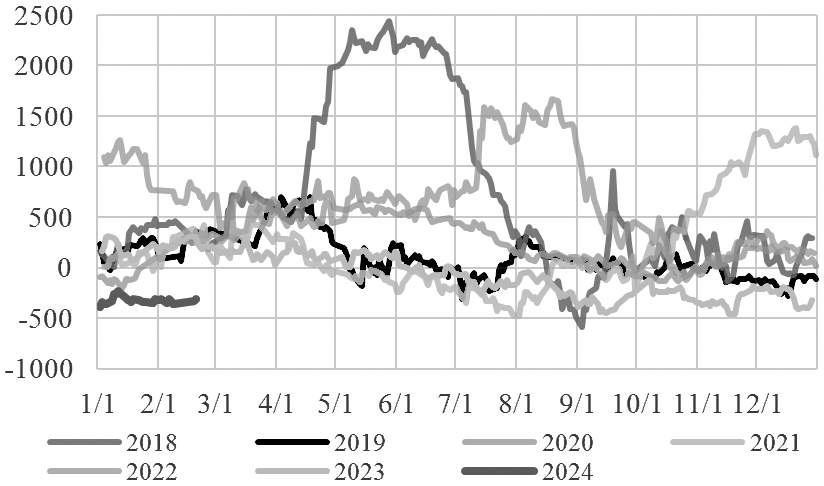 [国际油价延续偏强格局] 春节假期期间,国际油价较节前涨超3%,主要原因有两方面:一是OPEC坚持减产有一定成效;二是中东地缘政治局势充满不稳定性。从OPEC最新公布的1月数据来看,OPEC依然在坚定推进减产。考虑到新增减产计划的时限是2024年一季度,OPEC整体的减产履行率已超33%,进度向好,其中伊拉克完成约50%进度,因此OPEC产油国实际上只有阿联酋还没有进展。巴以冲突、俄乌冲突以及红海局势的动荡在近期都对原油市场造成了较大的冲击,这也是假期油价上行的主要原因。但地缘政治局势往往具有很大的波动性,一旦某一地区的冲突得到缓和,后续油价或回吐涨幅。 供给端有利好出现,需求端也出现了利空因素。从三大机构最新月报对需求前景的预测来看,虽然EIA和OPEC变动不大,但IEA大幅下调了2024年全球原油需求,仅有120万桶/日,是所有预测中的最低值,较去年同期下滑40%,意味着2024年原油市场需求前景仍不乐观。此外,美国炼厂开工率持续下滑,较春节假期前下跌1.80%;美国商业原油出现累库迹象,库存较春节假期前上涨2.81%,市场对需求前景的预测呈现利空趋势。 总体来看,当前地缘因素给原油市场带来的不确定性较大。假期期间,国际油价延续偏强格局,石脑油相对弱势,乙烯价格相对稳定,整体来看乙二醇成本端支撑依旧强烈。