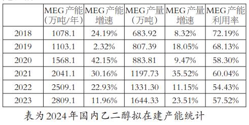 图为乙二醇华东港口库存合计(单位:万吨) [产能增速已有明显下降] 回顾2023年,乙二醇仍处在产能扩张阶段,截至2023年年底,乙二醇行业总产能提升至2809.1万吨,产能增速为11.96%。由于下游聚酯行业扩能带动乙二醇行业需求快速提升,以及国内煤企环保转型升级要求,乙二醇行业2020—2022年处于高投产周期。高投产背景下,乙二醇受供应压制一直处于低估值状态,年均价在4085元/吨,环比下跌10.2%。行业快速扩张导致行业利润挤压,市场完全竞争,各工艺制乙二醇也基本均处于亏损状态,仅有乙烷制乙二醇有微薄利润,煤化工亏损最为严重。 相比2020—2022年,2023年乙二醇产能增速已有下降。步入2024年,国内乙二醇新增产能明显收缩,预计新增产能250万吨,考虑到实际投产时间影响预计兑现新增产能在130万吨,且投产时间多在年中之后。整体来看,上半年乙二醇新增产能对供应端难以形成冲击,多关注现有存量装置的开工提升率及检修兑现情况。