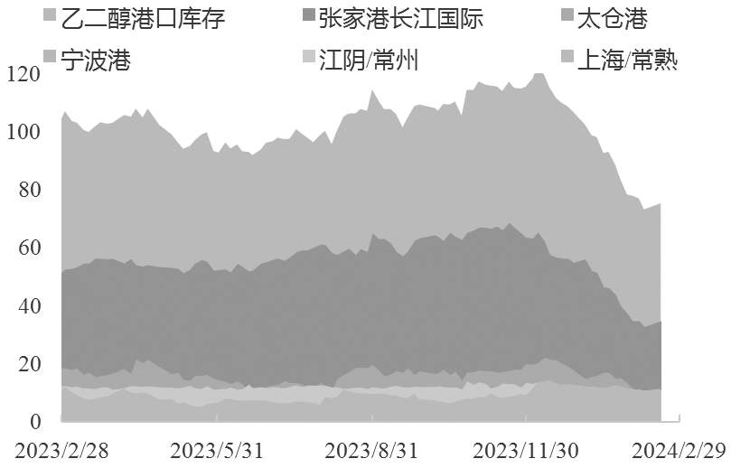 [港口仍有一定去库预期] 截至2月18日,华东主港地区MEG港口库存总量为75.3万吨,较上一统计周期增加2.11万吨。假期期间物流受到一定影响,港口库存小幅累积。但相比去年年底,乙二醇港口库存大幅下降了31.5万吨。节后聚酯端有一定的补库需求,预计乙二醇节后港口仍有一定的去库预期。 从整个华东地区来看,库存合计在74.79万吨,相较于去年年底下降约30.5万吨。产能方面,截至2月15日,国内乙二醇总产能利用率在65.89%,环比上升2.88%,其中一体化装置产能利用率为68.74%,环比上升2.80%;煤制乙二醇产能利用率为60.79%,环比上升3.03%。