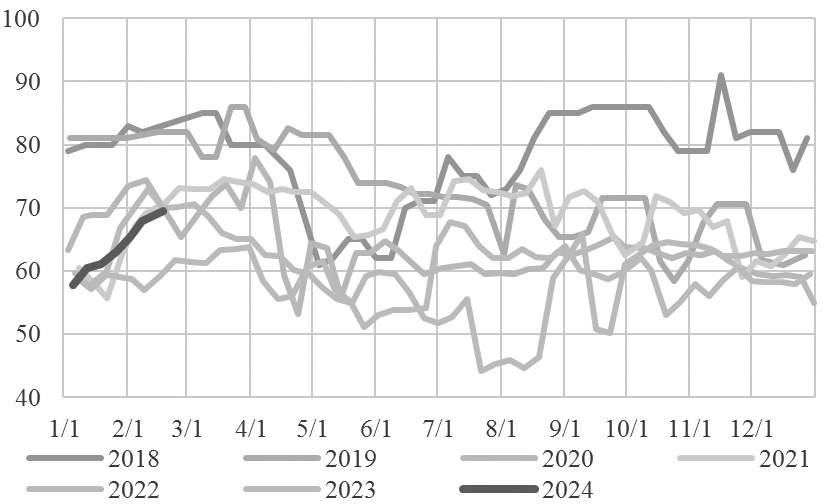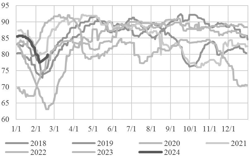 图为非乙烯法制乙二醇开工率(单位:%)