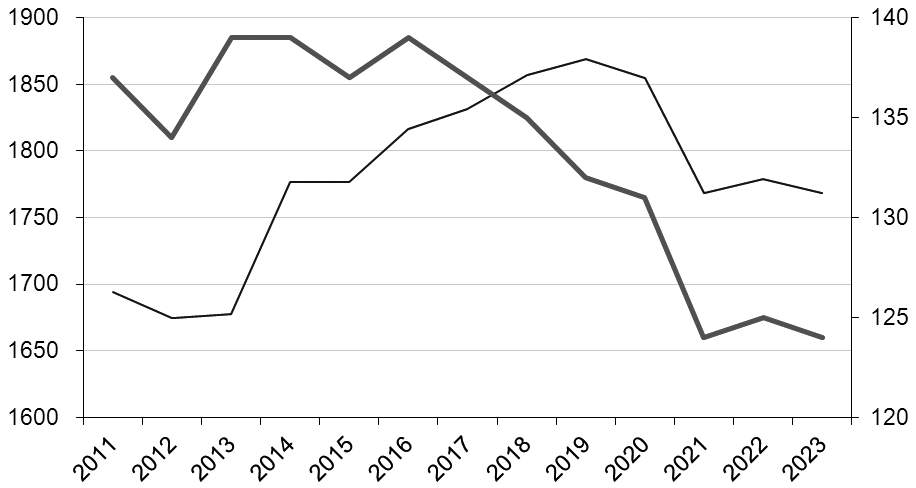 图为美国重质油月度进口占比 究其原因,是美国本土原油结构轻质化,而用于催化重整的轻质原油含烷烃量高、含芳烃量低、杂质少、易挥发,经催化重整得到的芳烃组分含量远不及重质原油。美国炼厂需要加强重质油进口、替换本土轻质油作为重整装置的原料,以满足本国对芳烃组分的需求。 炼能长期清退,老装置流失 根据EIA的数据,2011年以来,美国炼厂运行数量由最高139家缩减至2023年的124家;美国炼厂常减压蒸馏炼能由2011年的1694万桶/日提升至2019年的1869万桶/日后快速回落,2023年预计为1768万桶/日,低于2014年的水平。