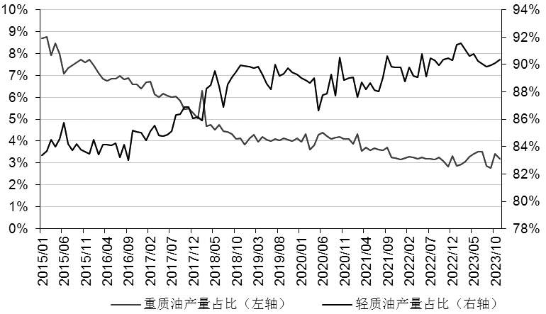 图为美国轻质油和重质油产量占比 2011年页岩油革命后,美国一跃成为世界第一大产油国。截至2021年年末,美国原油产量占全球总产量的18.45%,较2011年增长9个百分点。在产量跃升的同时,美国产原油的API度也在提升,即原油的结构呈现轻质化趋势。根据公开信息整理,美湾炼厂加工的原油,平均API度自2011年的28.2上升到2018年的32.6。 根据EIA的定义,重质油的API度≤27、轻质油的API度≥35、中质油的API度处于27—35之间。 从EIA依据API度划分的原油日产量数据中可以发现,自2015年有分项数据以来,美国轻质油产量从740万桶/日增加至2023年的1100万桶/日。其间,轻质油的产量占比自83%攀升至91%,而重质油的产量占比自8.5%下滑至3%。 在生产日渐轻质化的同时,美国进口原油则向重质化趋势发展。根据EIA的数据,2011年页岩油革命开始时美国进口重质油占比为44%,到2015年,重质油进口占比已至60%—70%,此后便稳定在该区间。