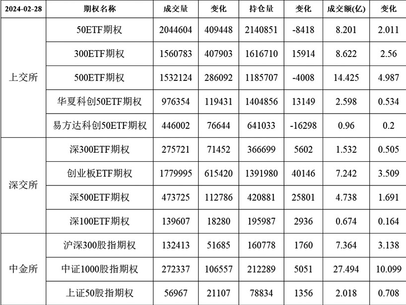 表为期权成交、持仓情况 盘后数据显示,50ETF期权市场活跃度大幅上升,而受到期日影响,持仓量略有回落。当日期权总持仓2140851张,较前一交易日减少8418张。其中,认购持仓1088455张,较前一交易日减少8921张;认沽持仓1052396张,较前一交易日增加503张。持仓量PCR为0.9669,较前一交易日提升0.0083。与此同时,全市场合计成交2044604张,较前一交易日增加409448张。其中,认购成交1150657张,较前一交易日增加262285张;认沽成交893947张,较前一交易日增加147163张。成交量PCR为0.7769,较前一交易日下降0.0637。 其余期权品种成交活跃度多数上升。具体而言,沪300ETF期权成交量为1560783张,持仓量为1616710张,成交额为8.622亿元;500ETF期权成交量为1532124张,持仓量为1185707张,成交额为14.425亿元;华夏科创50ETF期权成交量为976354张,持仓量为1404856张,成交额为2.598亿元;易方达科创50ETF期权成交量为446002张,持仓量为641033张,成交额为0.96亿元;深100ETF期权成交量为139607张,持仓量为195987张,成交额为0.674亿元;创业板ETF期权成交量为1779995张,持仓量为1391980张,成交额为7.242亿元;深300ETF期权成交量为275721张,持仓量为366699张,成交额为1.532亿元;深500ETF期权成交量为473725张,持仓量为420881张,成交额为4.738亿元;上证50股指期权成交量为56967张,持仓量为78834张,成交额为2.018亿元;沪深300股指期权成交量为132413张,持仓量为160778张,成交额为7.364亿元;中证1000股指期权成交量为272337张,持仓量为212289张,成交额为27.494亿元。 当日,各品种期权购沽隐含波动率走高,处于历史均值上方。其中,科创50、中证1000等期权隐含波动率接近历史高位,合成标的收平。 操作上,短线或可轻仓做多隐含波动率。中长线看,各大指数估值处于历史低位,下方空间有限,但上涨压力也较大,持有现货或期货多头的投资者,建议采用备兑策略,执行价可选压力位附近的价格,以降低持仓成本为主。(作者单位:方正中期期货) (责任编辑:admin) |