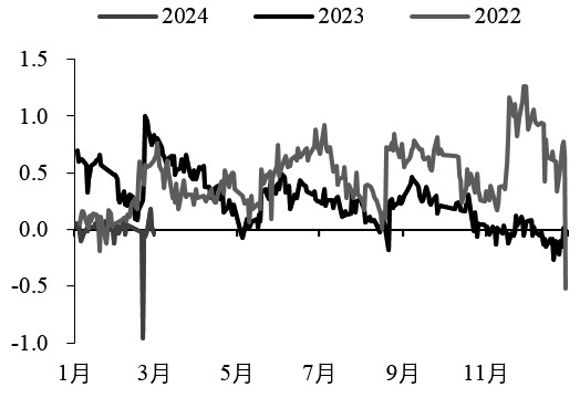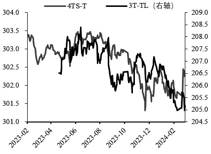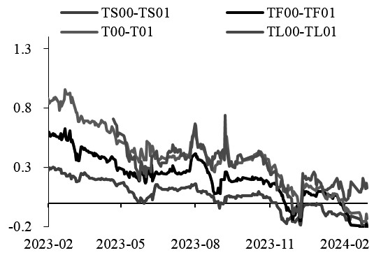 图为跨品种价差 国债价格本轮涨势先后由降准意外落地和降息预期升温驱动,叠加市场在经济温和复苏背景下维持弱风险偏好,机构大量买入利率债以满足跨年后的期限配置需求。年初以来,央行层面货币政策动用的总量工具较多,宽货币与宽信用均有所侧重,并且在一定程度上超出市场预期。 单边方面,2月20日LPR利率非对称调降5年期25BP,宽信用之意明确,债市盘面反映宽地产信用微调后又再走强,期债市场继续表现出对利好敏感,对利空钝化的特征,反映多头情绪依然强势。 2月22日吉林、广西等地银行公布存款利率调整公告,银行自发式降息推动了债券再次走强。最新公布的部分重要经济数据显著改善、央行召开做好金融五篇大文章工作座谈会等基本面利好因素,并未有效抑制期债涨势,原因在于高频数据仍然显示房地产恢复偏慢,经济向上动能稍显不足。期债对于政策的敏感度更强,但当前也未见更多政策预期释放,表现为调降存贷款利率及加大逆回购净投放带动国债利率继续下行,政策环境于期债亦偏友好。