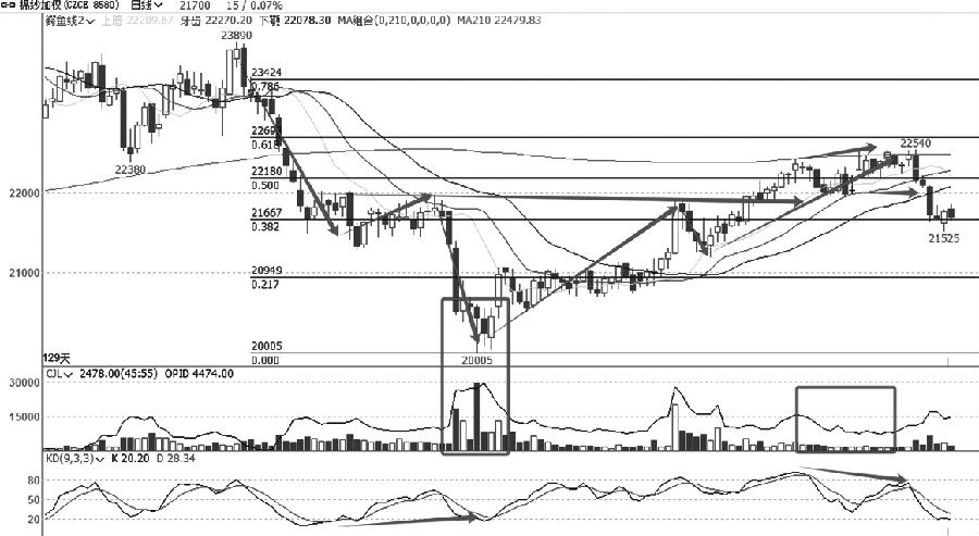 从棉纱加权日线走势图可以看出,棉纱经历一轮大幅走低后见底反弹,随后形成头肩底反转形态,进而继续反弹,价格虽然突破了前下跌幅度50%的位置,抵近0.618一线,但承压于210日均线的压力止步反弹。在此一线,价格见顶并形成顶部背离,展开回落调整走势。近日棉纱增仓放量大幅走低,价格跌破前调整低点,不仅形成对反弹趋势的否定,还完成了走势结构的逆转。在冲顶过程中,棉纱大幅减仓缩量,而在下跌过程中增仓放量,说明后市会有深度,但是均线系统由多头排列直接转到空头排列需要一个过程,价格走势会在均线附近反复,随后才会有更强劲的回落。(中辉期货 李卫东) (责任编辑:admin) |