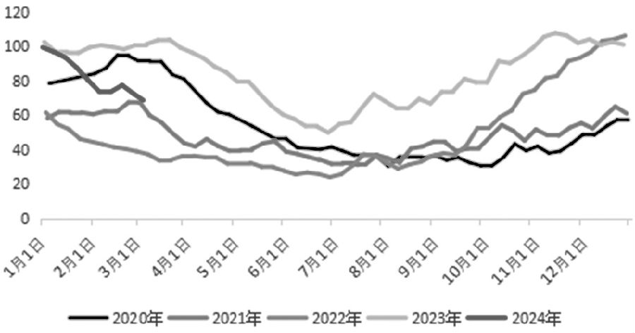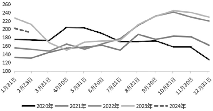 图为马来西亚棕榈油库存(单位:万吨) 产地库存下降。马来西亚棕榈油局(MPOB)公布的数据显示,1月底马来西亚棕榈油库存为202万吨,环比下降11.83%,低于市场预期,是2023年8月以来的最低值,该报告对盘面价格有利好作用,为棕榈油期价提供了上行驱动。目前产地尚处于减产期内,而且马来西亚斋月即将来临,油脂备货需求或推动马来西亚棕榈油库存继续下降,投资者可关注3月11日MPOB公布的马来西亚2月棕油库存数据,目前市场预期为191万—193万吨。 从4月份开始,棕榈油产地将进入增产季节,但大概率会因之前厄尔尼诺现象带来的干旱导致增产幅度不及往年。目前市场预期2024年印尼棕榈油产量较往年至少减少100万吨,而马来西亚棕榈油产量可能与往年持平。但随着印度和中国的需求持续增加,以及印尼本地生柴政策(B35)的实施,全球棕榈油供需格局或转向紧张,将为棕榈油价格提供支撑。 国内去库明显。由于前期进口利润倒挂,国内买船较少。相关机构调研数据显示,截至2024年3月1日(2024年第9周),全国重点地区棕榈油商业库存为61.815万吨,较前值减少6.25%,较上年同期减少39.92%。国内棕榈油库存已降至近5个月低点。从后续到港情况看,3月棕榈油到港15万吨左右,处于偏低水平。且伴随天气逐步转暖,下游补库需求释放,国内棕榈油库存或进一步下降。