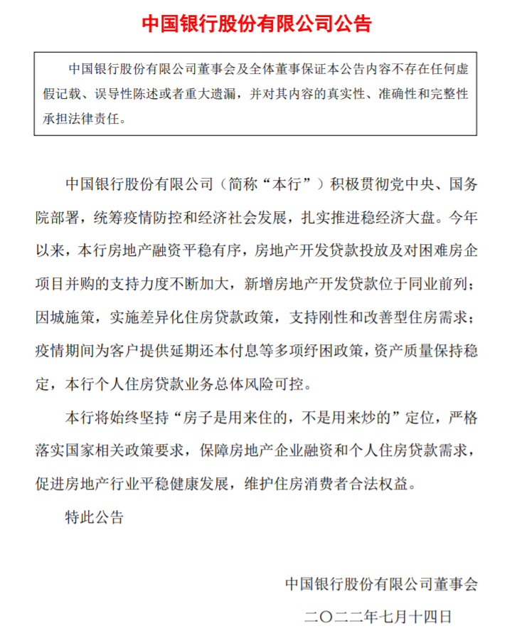 ![]() 中国建设银行:涉及规模较小,总体风险可控 中国建设银行公告称,当前部分地区停工缓建和未按时交付楼盘情况,涉及本行规模较小,总体风险可控。建设银行将密切关注合作企业和楼盘情况,积极配合地方政府做好客户服务工作,与客户做好沟通,促进房地产市场平稳健康发展。 ![]() 中国农业银行:涉及“保交楼”风险的业务规模较小,总体风险可控 中国农业银行表示,截至2022年6月末,本行个人住房贷款余额5.34万亿元。其中一手楼合作楼盘5.7万个,一手楼按揭贷款余额3.97万亿元。已初步认定存在“保交楼”风险的楼盘涉及逾期按揭贷款余额6.6亿元,占全行按揭贷款余额的0.012%,占一手楼按揭贷款余额的0.017%。目前涉及“保交楼”风险的业务规模较小,总体风险可控。 ![]() 中国银行:个人住房贷款业务总体风险可控 中国银行在公告中说,今年以来,该行房地产融资平稳有序,房地产开发贷款投放及对困难房企项目并购的支持力度不断加大,新增房地产开发贷款位于同业前列;因城施策,实施差异化住房贷款政策,支持刚性和改善型住房需求;疫情期间为客户提供延期还本付息等多项纾困政策,资产质量保持稳定,该行个人住房贷款业务总体风险可控。 ![]() 交通银行:规模和占比较小,风险可控 交行公告称,本公司严格执行国家各项信贷政策,坚持“房住不炒”的定位,积极支持居民合理自住购房需求。 今年以来,本公司按揭贷款运行良好,截至6月末,境内行住房按揭贷款余额近1.5万亿元,资产质量稳定。近期个别房地产企业风险暴露,导致部分城市的项目出现停工、延期交付的情况。经初步排查,媒体报道中存在风险的楼盘所涉及的本公司逾期住房按揭贷款余额0.998亿元,占本公司境内住房按揭贷款余额0.0067%,规模和占比较小,风险可控。 下一步,本公司将密切关注合作企业和楼盘状况,严格落实监管机构要求,积极配合地方政府做好“保交楼、保民生、保稳定”金融服务,维护房地产市场平稳健康发展,维护消费者合法权益。 ![]() 邮储银行:规模和占比小,风险可控 邮储银行称,本行始终坚持审慎的风险偏好,支持客户刚性和改善性购房需求。 目前,住房贷款余额超过2万亿元,笔均金额约44万元,房地产类不良贷款率处于行业较低水平。 本行密切关注部分地区出现的停工缓建和未按时交付楼盘情况,开展深入排查,初步认定的停工项目涉及住房贷款逾期金额1.27亿元,规模和占比小,风险可控。 下一步,本行将坚决贯彻落实党中央、国务院决策部署,坚持“房住不炒”定位,严格落实金融监管要求,积极做好客户服务。对于受疫情影响的客户,提供延期还款、征信保护等支持,为客户纾困解难。 ![]() 相关报道银保监会回应“停贷”事件:引导金融机构市场化参与风险处置 多家银行公告:未按时交付楼盘的按揭贷款规模较小 总体风险可控 (文章来源:每日经济新闻) (责任编辑:admin) |