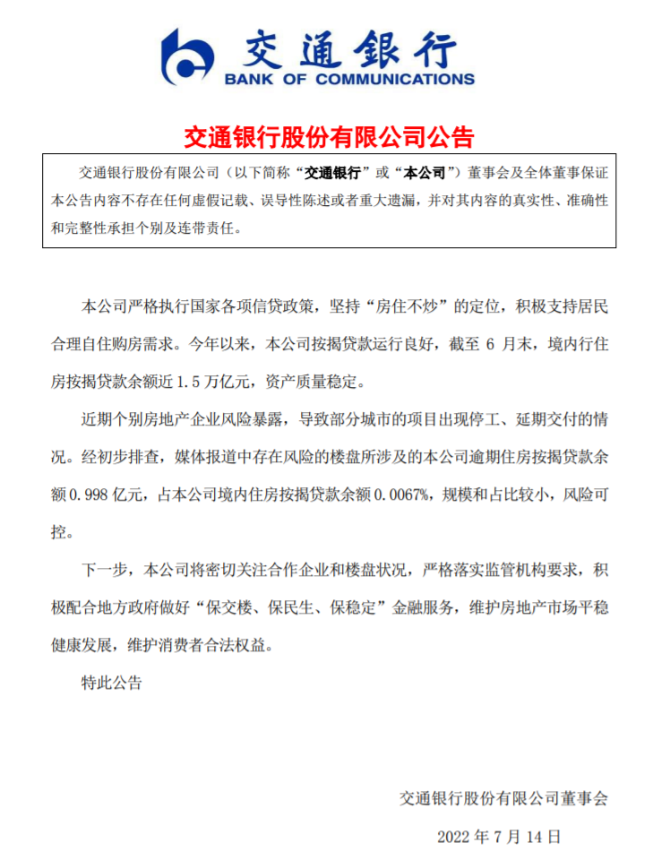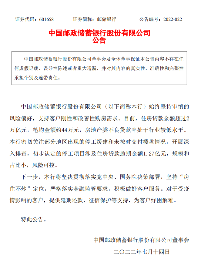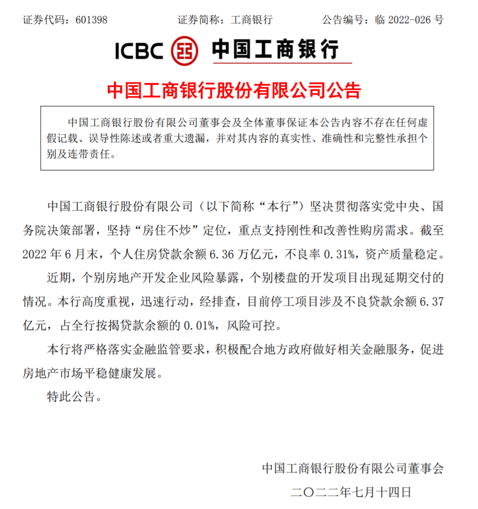 | 最近,多地业主因楼盘延期交付宣布停止还贷的事件引发广泛关注。 据央视新财经,对此,银保监会有关部门负责人14日作出回应,表示将引导金融机构市场化参与风险处置,加强与住建部门、中国人民银行工作协同,支持地方政府积极推进“保交楼、保民生、保稳定”工作。 此外,14日,工、农、中、建、交、邮储六家大型国有商业银行以及兴业银行、平安银行、光大银行等均发布公告回应。 银保监会回应“停贷”事件:引导金融机构市场化参与风险处置 央视财经报道,银保监会有关部门负责人表示,最近关注到个别房企楼盘出现延期交付情况,这件事的关键在于“保交楼”,对此银保监会高度重视。 ![]() 图片来源:央视财经 下一步工作中,银保监会将继续贯彻落实好党中央、国务院决策部署,坚持“房子是用来住的、不是用来炒的”定位,坚持稳地价、稳房价、稳预期,保持房地产金融政策的连续性、稳定性,保持房地产融资平稳有序,支持商品房市场更好满足购房者合理住房需求,引导金融机构市场化参与风险处置,加强与住建部门、中国人民银行工作协同,支持地方政府积极推进“保交楼、保民生、保稳定”工作,依法依规做好相关金融服务,促进房地产业良性循环和健康发展。 多家银行发公告回应“停贷”事件:规模较小,总体风险可控 14日,多家银行发布公告称,对近期网传“停贷”事件中涉及的楼盘展开排查,目前发布公告的银行均表示,涉及的贷款业务规模较小,不会对银行经营构成重大影响。 14日,工、农、中、建、交、邮储六家大型国有商业银行以及兴业银行、平安银行、光大银行等均发布公告,称已经对近期个别房地产企业风险暴露、住房开发项目延期交付情况展开排查,目前已发公告的多家银行均表示,涉及的业务规模较小,整体风险可控。 中国工商银行:目前停工项目涉及不良贷款余额6.37亿元,风险可控 中国工商银行表示,截至2022年6月末,该行个人住房贷款余额6.36万亿元(人民币,下同),不良率0.31%,资产质量稳定。近期,个别房地产开发企业风险暴露,个别楼盘的开发项目出现延期交付的情况。该行高度重视,迅速行动,经排查,目前停工项目涉及不良贷款余额6.37亿元,占全行按揭贷款余额的0.01%,风险可控。