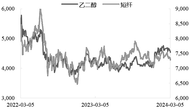 图为短纤与乙二醇主力合约期货收盘价走势(单位:元/吨) 现货端加工费存修复预期 截至2月29日,我国涤纶短纤工厂权益库存13.21天,较前一期下降0.71天;物理库存23.03天,较前一期下滑0.91天。虽然短纤工厂仍有部分检修装置尚未重启,但节后下游负荷提升缓慢,目前仍未达到去年同期水平,导致短纤工厂假期累积的库存消化十分缓慢,现货流动性相对充裕。并且,涤纱企业节后原料备货积极性偏弱,截至2月29日,纯涤纱原料备货平均13.45天,较前一周下滑0.30天。下游内贸订单启动略显缓慢,叠加纱厂开工不及往年同期,目前仍处于提升状态,纱企多先消耗自有库存,观望氛围浓厚下,原料采买热情缺乏。此外,涤纱厂节前库存已有明显去化,且多数工厂订单可接至2月底至3月中,并且节前由于短纤价格持续上涨,纱厂在自身加工费低位的情况下备货水平并不高,故而预计节后可能仍存一波刚需备货行情。 现货流动性充裕而需求不足的背景下,短纤工厂现货加工费持续低位。春节后短纤加工费持续在600—700元/吨附近运行,工厂皆亏损严重。短纤、瓶片利润较差,已低至3年来低点水平。 但回顾往年同期走势,春节后由于现货供应充裕而需求恢复不足的问题导致的加工费严重压缩的问题几乎每年都有出现。目前来看,上周湖州中磊公布一套30万吨/年短纤装置的检修计划,同时目前短纤装置总体仅维持70%附近的负荷,不及去年同期负荷和产量水平。由于加工费的持续低位或能加速缓和行业供需矛盾,后续短纤现货加工费仍存一定修复预期,并且部分短纤工厂检修时间较长,后续工厂累库的压力将有所减轻。