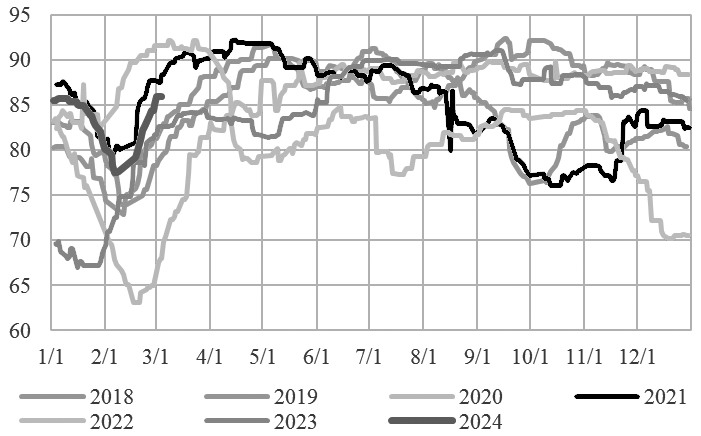 图为国内聚酯产业链开工率(单位:%) 节前下游纯涤纱企业部分订单良好,但2月初假日临近对短纤价格的向下传导产生了不少阻碍。节后归来,在库存经历一定的消化后涤纱企业加工费得到了一定修复,但福建地区的涤纱工厂仍处于亏损之中。正月十五之后,伴随工人的陆续到位,纱厂负荷亦提升明显。截至2月29日,纯涤纱行业平均开工率在62.78%,较前一周上升10.46%,需求缓慢恢复,且受工人复工进程影响,负荷暂未恢复到正常水平,但相比节后仍呈提升状态;全国棉纺织综合开工率为50.73%,较前一周开工增加18.60%。但受限于工人复工以及资金、订单情况等,织造业开工率仍未恢复到正常水平。 从涤纱企业库存来看,目前纯涤纱行业周均库存下降2.26天,基本处于3年来偏低水平,但是当前库存的偏低水平主要是由于节后新订单下达依旧有限,并且节前部分企业外贸订单由于担忧地缘局势影响运输时间而进行了提前动作,总体而言下游消费仍然不及预期。但与此同时,有部分工厂反馈,进入3月,春夏面料询单气氛明显好转,加上中间商询价力度加强,坯布走货情绪有所好转。目前开工工厂在做订单多数以年前订单为主,新订单目前反馈分化较大,外贸订单较为混杂,市场仍存较强的谨慎情绪,需求恢复有待进一步观察。 总的来说,地缘风险不稳定因素较多,叠加OPEC+考虑减产延续,原油或延续偏强格局,底部支撑相对稳固。节后春季订单陆续到来,聚酯链各环节库存偏低,但供应相对充足,终端需求恢复情况仍需观察。目前聚酯原料端处于多空交织、等待进一步利好的状态;而聚酯产品虽然产销暂未有明显改善,但库存仍处于可控范围,成本支撑下,价格走势也相对坚挺。后市关注聚酯下游终端复工及PTA装置检修情况。