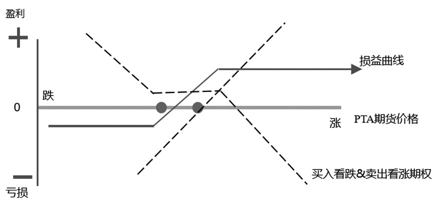 图为买入宽跨式(买入K2看涨+买入K1看跌)收益与标的资产价格关系 [从基本面看组合方式选择] 在构建PTA期权组合策略之前,需先对PTA基本面进行分析。近期PTA期价一直在5750—6100元/吨之间振荡,PTA受成本端PX供应过剩提振不足、新装置投产预期短线走弱,但中长期来看,PTA仍有成本端支撑上行驱动。 成本端原油及PX 方面,地缘扰动仍存及供应端OPEC+继续控制产出,需求端汽油需求将季节性回升,短线仍维持高位振荡。PX方面,国内及亚洲开工均稳定在近年来的高位,国内平均负荷接近82%,亚洲则达到76%。但PTA开工未有明显跟进,使得PX自10月开始累库超过75万吨。在PX持续累库压力下,供应商出货压力较大,促使PX价格进一步走弱。3月PX装置检修有限,但进入4月亚洲PX装置检修增多,开工率有望下降至70%附近。后市来看,在调油利好兑现及装置检修开启之后,PX期价有望企稳反弹。 从PTA供需情况来看,上周PTA装置负荷小幅上升,福海创450万吨装置负荷提升至七成偏上,其他个别装置负荷小幅调整,目前PTA装置负荷调整至84.1%(+1.5%)。新增产能投产方面,台化150万吨PTA新装置将于3月底投产,仪征化纤300万吨PTA新产能也将于3月底投产其中的150万吨,待运行稳定后投产另外的150万吨。PTA面临开工回升及新增产能投放供应压力增加。聚酯检修装置仍在开启恢复过程中,同时也有个别装置检修。截至3月7日,初步核算国内大陆地区聚酯负荷在88.7%附近,3月中下旬聚酯负荷将回到90%左右。 从终端来看,江浙终端开工恢复至高位,截至3月7日,江浙下游加弹、织造、印染负荷分别在91%(+18%)、80%(+17%)、82%(+10%)。展望后市,近期PTA加工费尚可,留意PTA部分装置公布后期检修计划执行情况。节后聚酯工厂库存较节前明显抬升,聚酯工厂面临库存压力相对较大,累库格局下,短期PTA流动性预计仍偏宽松。综合来看,短期PTA受成本端PX供应过剩提振不足、新装置投产预期走弱。但中长期来看,PTA仍有成本端支撑及下游开工回升上行驱动。 通过对PTA期价分析之后可以得出,PTA面临短空长多的供需格局,短期合理价格区间为5600—6100元/吨,短期下跌主要跟随成本端回调,随着检修落地、供需改善,后期价格有望走高。针对不同企业的风险敞口特设计如下期权策略方案: 一是套保策略—领式期权。领口期权是指企业拥有现货或期货多头的基础上,卖出看涨期权,买入看跌期权,该策略适用于企业手中已有PTA现货或期货多头头寸,需要进行保值,在有一定利润后愿意卖出,同时因为企业风控要求,需要规避下方风险。 如某PTA现货企业拥有PTA1000吨,企业希望能以6000元/吨的价格卖掉,同时希望能够规避库存跌破5600元/吨的风险。此时企业可卖出TA405-C-6000看涨期权,同时买入TA405-P-5600。结合3月8日场内期权报价,买入一份TA405看跌期权,标的价格5808元/吨,执行价格5600元/吨,期限32天,付出权利金25.5元/吨;卖出TA405看涨期权,执行价格6000元/吨,期限32天,收获权利金35.5元/吨,期初可收取权利金10元/吨,构建组合期权权益为正的期权策略。 风险提示:该策略可以锁定风险,但最大收益有限,适用于对未来上涨幅度预期较为保守的情形。同时,若标的价格大幅下跌,策略存在亏损。
