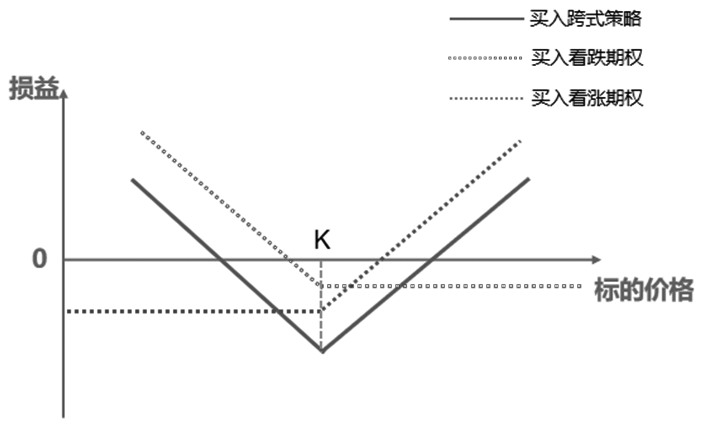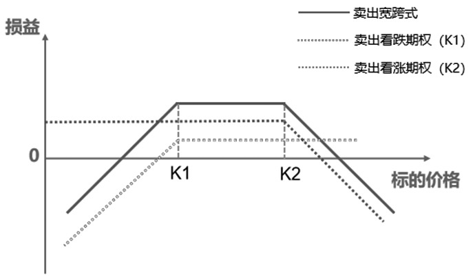 图为卖出跨式(卖出K2看涨+卖出K1看跌)收益与标的资产价格关系 振荡策略(卖出K2看涨+卖出K1看跌)的基本原理,即卖出宽跨式期权由卖出一手虚值的看涨期权(高行权价)和一手虚值的看跌期权(低行权价)组成。宽跨式期权合约都是虚值期权,卖方收取的权利金比跨式期权少。该策略适用于投资者预期市场到期前一段时间不会剧烈波动,只是进行一些再付的价格调整,可以使用卖出宽跨式期权获取权利金收入。 突破策略(买入K看涨+买入K看跌)的基本原理,即买入跨式期权由买入一手平值看涨期权和一手平值看跌期权组成。该策略适用于当投资者预期将会出现大幅波动,但不确定波动的方向,可以使用买入跨式期权,从价格突破性波动中获利。