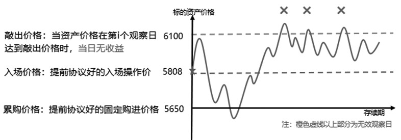 图为构建的领式期权收益与标的资产价格关系 二是奇异期权—回归累购。累计期权是复杂期权的一种,设置取消价和行权价,行权价通常比签约时的市价有折让,行权价可理解为现货企业愿意建立库存的采购价格。相比于普通期权单一到期日,累计期权有一系列的观察日,每个观察日等同于一个采购时点,分散风险的同时更契合实际经营情况。累购适用于PTA贸易企业,使用累购在当前位置制定未来一段时间内的采购计划,提前锁定现货采购价。当PTA期价短期内进入区间振荡的场景且看好后市期价,价格始终高于目标建仓价位时,使用累购能够实现折价建仓的效果,以低于市价的建仓价格买进标的,增厚收益。相较普通期权,累购期权可以做到进场即有收益,并且权利金以0成本实现。 结合3月8日场内期权报价,2024年3月8日起,32个交易日内,每日现货采购量为100吨,每个观察日,若是6100元/吨≥PTA期货收盘价≥5808元/吨,则风险管理公司当日向企业补贴收盘价超出5808元/吨的部分;若是PTA期货收盘价≤5650元/吨,则企业当日需以5650元/吨采购2倍量(即为200吨)的PTA现货;若是PTA 期价> 6100元/吨,则当日不执行采购。