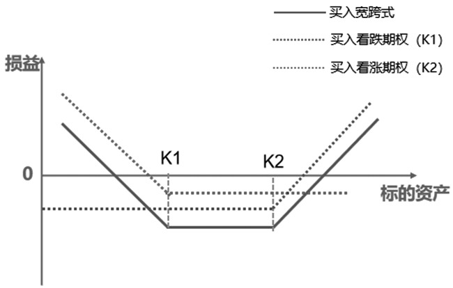图为买入宽跨式(买入K看涨+买入K看跌)收益与标的资产价格关系 突破期权(买入K2看涨+买入K1看跌)的基本原理,即买入宽跨式期权由买入一手虚值的看涨期权(高行权价)和一手虚值的看跌期权(低行权价)组成。宽跨式期权合约都是虚值期权,买方支付的权利金比跨式期权少。如果投资者预期市场将会出现大幅剧烈波动,但不确定波动的方向,可以使用买入宽跨式期权策略。