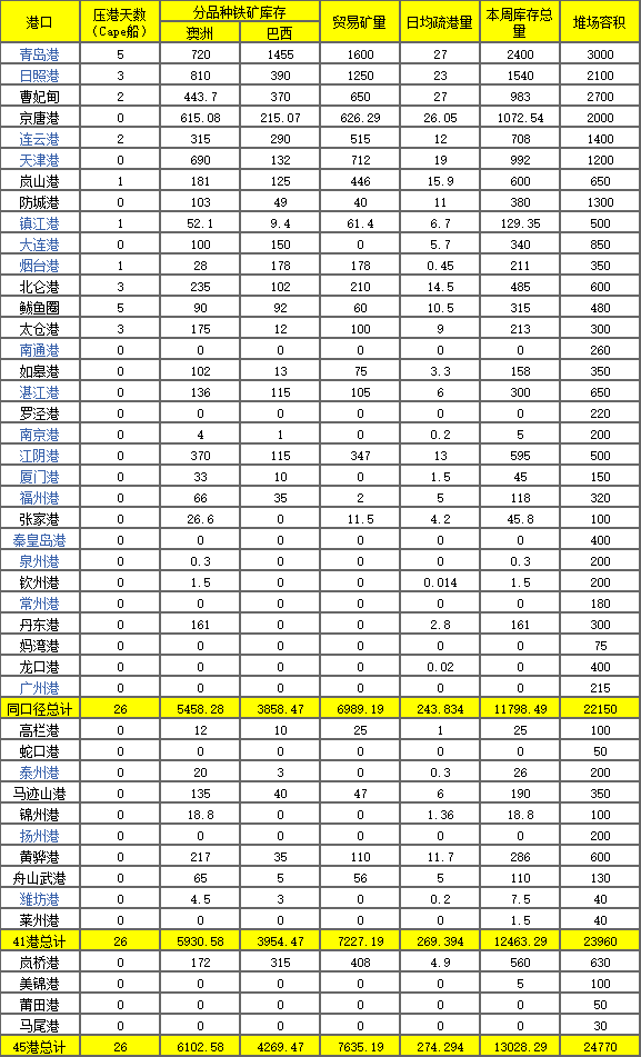 全国45个港口进口铁矿库存为13028.29万吨 环比增373.67万吨