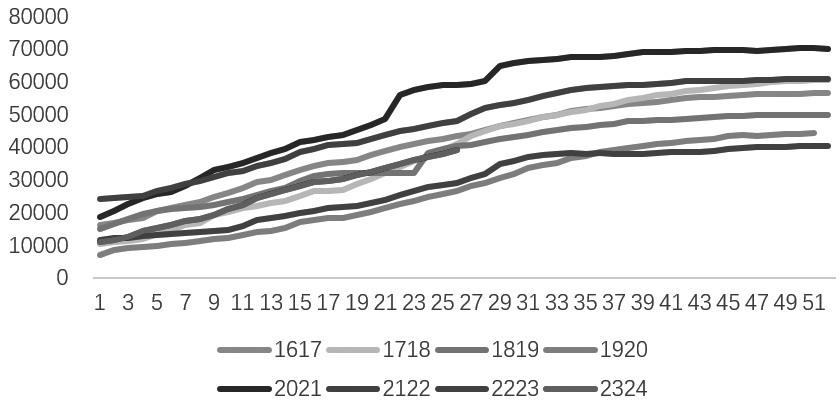 图为2016年以来美玉米累计销售量 (单位:千吨) 巴西方面,2023/2024年度巴西玉米产量约为1.24亿吨,巴西玉米消费量约为5200万吨,巴西玉米出口量约为5200万吨,巴西玉米期末结转库存约为617万吨。参考过去几年巴西玉米出口量可知,当前年度巴西5200万吨玉米出口量依旧处于相对高位,这会挤占一部分美玉米市场份额。除了美国和巴西之外,对我国玉米市场影响较大的是乌克兰。参照美国农业部3月供需报告,2023/2024年度乌克兰玉米产量约为2950万吨,2023/2024年度乌克兰玉米消费量约为500万吨,乌克兰玉米出口量约为2450万吨,乌克兰玉米期末结转库存约为282万吨。需要说明的是,自2020年俄乌冲突以来,乌克兰玉米产量和出口节奏受到比较大干扰。参考美国农业部统计数据, 2021/2022年度乌克兰玉米出口量约为2698万吨,2022/2023年度乌克兰玉米出口量约为2712万吨,2023/2024年度出口量约为2450万吨。综上数据,2023/2024年度乌克兰玉米出口目标量处于近3年相对低点。参考乌克兰海关数据,截至2月19日,乌克兰玉米累计出口量约为1470万吨,剩余可出口量约为980万吨。