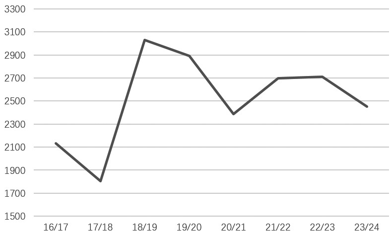 图为2016年以来乌克兰玉米出口量(单位:万吨) 综上可知,当前时间节点本年度美玉米出口压力依然是有的,这会压制美玉米价格反弹空间。另外,从中长期来说,巴西玉米产量最近几年快速增加,导致全球玉米产量同比呈现增长趋势。基于上述供需因素考虑,如没有地缘政治冲突和物流等因素扰动,国际市场玉米价格将维持低位运行。国际玉米价格维持低位,会限制国内玉米价格上涨幅度。 [新季产量同比增加] 根据我的农产品网统计数据,2023/2024年度我国玉米产量约为2.75亿吨,同比增加1650万吨,同比增幅约为6%。细分来看,2023/2024年度我国玉米产量同比增加主要原因在于玉米种植面积和单产都呈现增加趋势。根据我的农产品网统计数据,2023/2024年度我国玉米种植面积约为6.14亿亩,同比增加1100万亩,同比增幅约为1.8%。2023/2024年度我国玉米单产约为896斤/亩,同比增加39斤/亩,同比增幅约为4.3%。从中长期看,由于新年度国内玉米产量同比增加,国内玉米产需缺口同比缩小。另外,从短期来看,当前玉米市场参与者关注焦点依然在于农户卖粮节奏和贸易商购销心态。