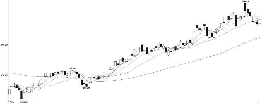 IF加权近期价格继续走强,并创出本轮反弹新高3583.6点。量能方面,近期价格反弹过程中,成交量变化不大,持仓量出现下滑。指标方面,均线系统走势逐步转强,MACD指标快慢线在零轴上方运行,但红色能量柱逐步缩小。综合来看,IF加权近期延续反弹,并不断创出新高,建议偏多思路对待。 十债 下破均线