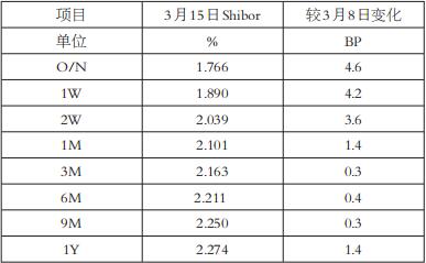 随着季末资金需求逐渐显现,上周国内市场利率呈现稳中有升的态势,其中短期利率上涨幅度更大。截至3月15日,上海银行间同业拆放利率(Shibor)隔夜、1周期、2周期、1月期、3月期、6月期、9月期、1年期利率分别报收于1.766%、1.890%、2.039%、2.101%、2.163%、2.211%、2.250%、2.274%,较3月8日分别上升4.6、4.2、3.6、1.4、0.3、0.4、0.3、1.4个基点。