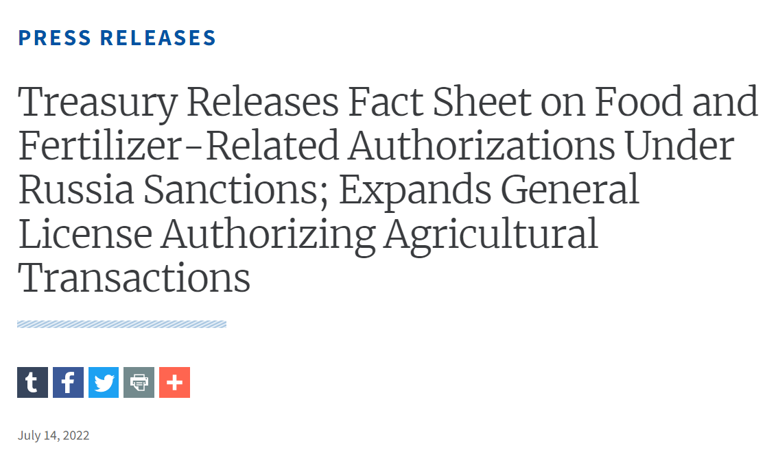 美财政部澄清:对俄罗斯的制裁措施并不包括农业和医药领域