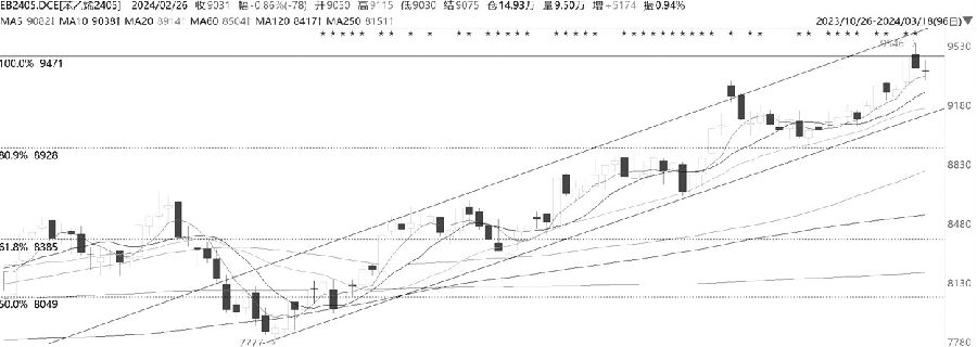 2023年9月中旬,高硫燃料油期货创出3575元/吨的阶段性高点之后持续回落,直至跌至黄金分割0.382对应的2970元/吨的支撑位后止跌反弹,近期价格振荡上行,开始检验黄金分割0.809对应的3400元/吨的压力位。 均线方面,高硫燃料油期货均线系统呈现多头排列,说明价格走势处于偏强格局。指标方面,MACD、KDJ、RSI指标均金叉后发散。量仓方面,近几日价格上涨,伴随着减仓缩量,上涨动能有所减弱。 整体上看,高硫燃料油跳空高开后延续涨势,均线多头排列,指标金叉,价格有望延续涨势。 苯乙烯 技术指标走弱