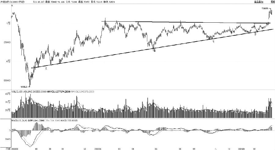 沪铜自2022年7月开始进入多头行情,至2023年2月完成第一阶段上涨,此后至上周突破70000元/吨关口前都处于调整过程。非常明显的是,整个调整过程高点全部集中在70000元/吨,历经8次左右的反复测试,直至以放量跳空的形式突破。从下方支撑来看,主要低点A、B、C和D组成的支撑线,仍然是未来最重要的多头趋势线。操作上,多头在不封闭缺口或不跌破趋势线的前提下都可以逢低做多。 碳酸锂 开启多头模式