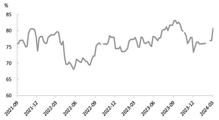 图为伊朗海运原油及凝析油出口量 全球石油消费出现季节性改善 机构预计2024年全球石油消费增速放缓。今年年初,全球经济仍然呈现弱复苏态势,目前机构对今年全球经济增长的预计普遍低于去年水平,这意味着石油消费增长也将受到明显制约。当前机构对全球石油消费增长预期仍存在一定分歧。EIA、IEA、OPEC预计2024年全球石油需求增幅分别为143万、130万、225万桶/日,但基于对经济增长放缓的预测,三大机构对2024年需求增幅的预期均低于2023年的水平。我们认为,在全球经济复苏驱动下,全球石油消费仍有望保持增长,但经济整体复苏动能较弱,对石油消费增长的推动也相对有限。而下半年在货币政策趋向宽松影响下,全球经济复苏步伐有望加快,叠加季节性因素影响,下半年全球石油消费将好于上半年。 美国石油需求出现改善。年初以来,美国石油消费处于季节性低位,但近两周,美国消费出现改善迹象,截至3月1日当周,美国炼厂开工负荷升至84.9%,为连续两周回升,同时美国汽油、馏分油库存持续下降。此外,美国汽油裂解表现坚挺,说明终端石油消费好转并对上游形成正向反馈。从季节性角度来看,随着天气的回暖,美国汽油需求将进一步改善,同时美国炼厂开工将延续季节性回升态势,原油加工需求有望进一步增长。 中国石油需求缓慢恢复。年初受春节因素影响,国内石油需求相对较弱。数据显示,中国1—2月原油进口为8830.8万吨,去年12月为4836.1万吨;中国1—2月成品油进口为757.6万吨,去年12月为476.2万吨。春节后国内消费缓慢恢复,主营炼厂开工在近期明显抬升,但地炼开工仍处低位。从国内成品油市场来看,进入3月,国内随着学校逐步开学以及工业企业逐步复产复工,自驾长途出行需求有所下降,而企业复工以及春耕备油将推动柴油需求好转,气强柴弱的格局正在逐渐切换,国内柴油裂解价差有逐步企稳回升之势。
